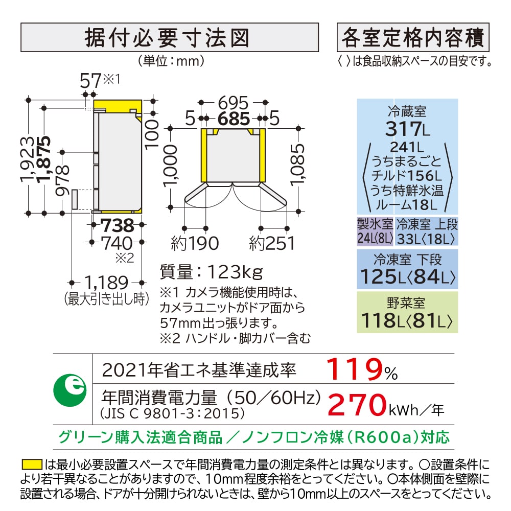 ※1 HXCCタイプはカメラユニット搭載のため、非搭載機種(2021年度同等機種:R-HX60R、R-HW60R)と比較して外形寸法の高さが4.2cm、据付必要寸法の高さが5cm大きくなり、カメラ機能使用時は、カメラユニットが前面側に5.7cm飛び出します。