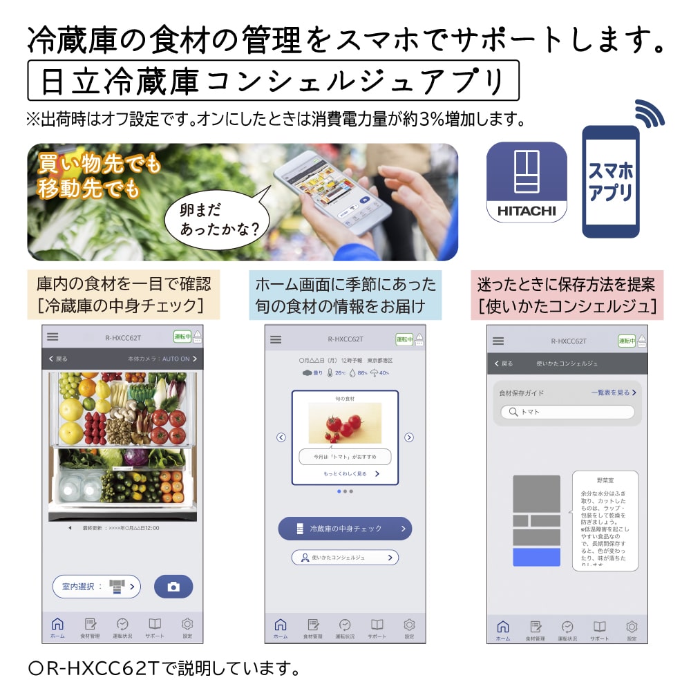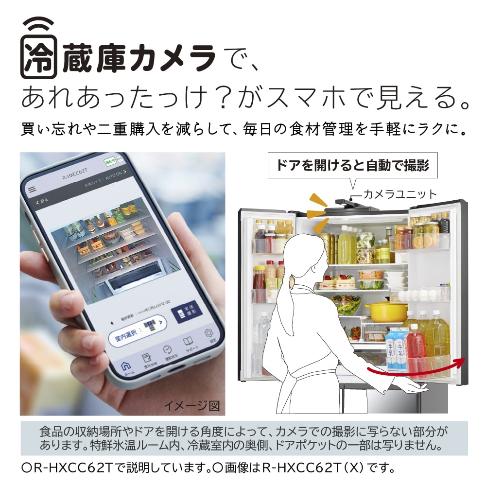 ※1 「冷蔵庫カメラ」の利用には「冷蔵庫コンシェルジュアプリ」を使用して、スマートフォンと冷蔵庫本体との連携が必要です。出荷時、アプリはオフ設定です。オンにしたときは消費電力量が増加します。