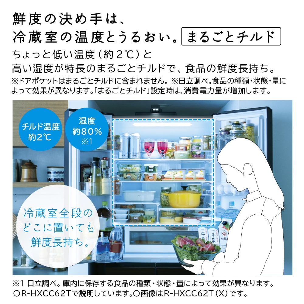 ※1 出荷時は「まるごとチルド」設定。設定時は消費電力量が増加。ドアポケットは「まるごとチルド」には含まれません。