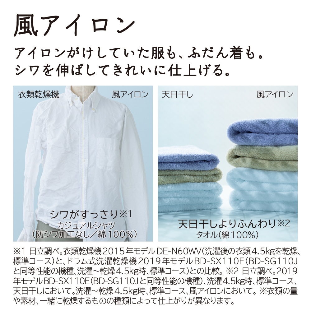 大容積のビッグドラムと、時速約300km(※1)の高速風でシワを伸ばしながら乾燥。アイロンがけしていた服も、ふだん着もシワを伸ばしてきれいに仕上げます。