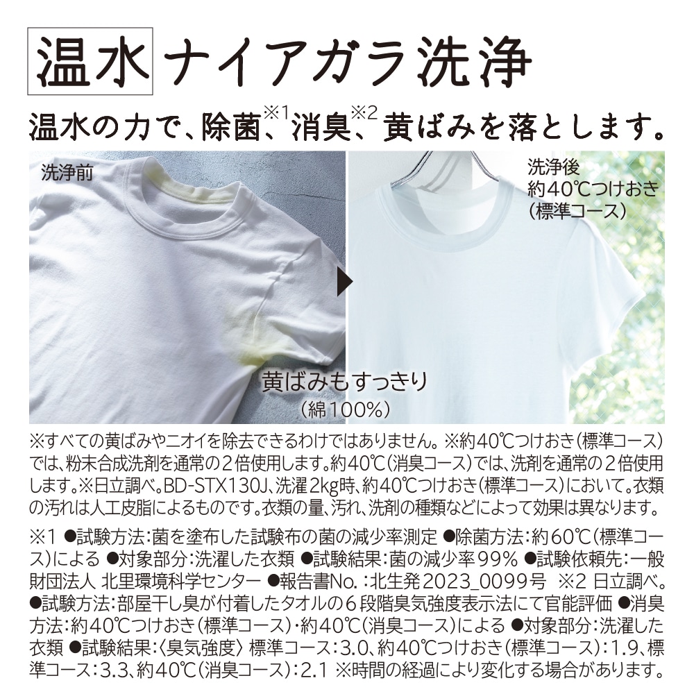 ※日立調べ。洗濯から乾燥コースにおいて。一般社団法人 日本電機工業会で定めた試験布に温度センサーを取り付けて計測。乾燥時の温度は衣類の素材により異なります。また、乾き具合によっては、衣類の温度が高くなる場合があります。