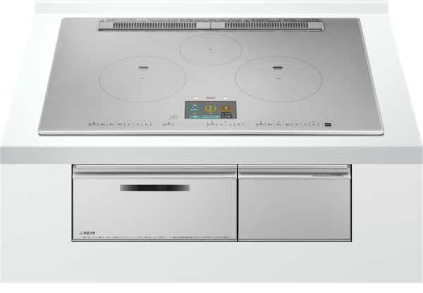 トッププレート手前中央に5インチの「カラータッチ液晶」を搭載。液晶画面に表示される写真やボタンを見ながら直感的にラクに操作やメニュー選択ができます。加熱中も火力を色と数字で表示するので、見やすくわかりやすいです。