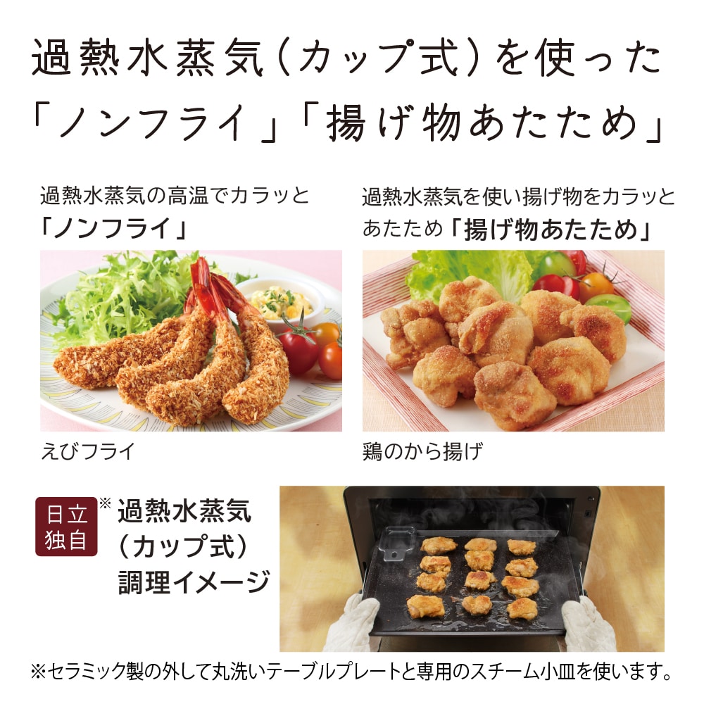 過熱水蒸気とオーブンを使い、油を使わずカラッとフライ調理ができる「ノンフライ」やオーブンと過熱水蒸気で、揚げ物の衣をサクッと、中までしっかりあたためる「揚げ物あたため」が搭載。
