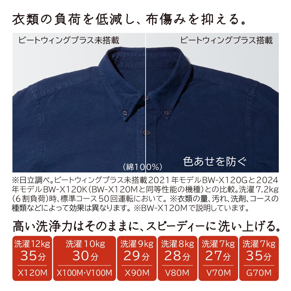 高濃度の洗剤液を衣類にすばやく浸透させ、[押し洗い][たたき洗い][もみ洗い]と大流量の[ナイアガラシャワー]で洗浄することで、しつこい汚れもすっきり洗い上げます。[ビートウィングプラス(回転羽根)]が生み出すスピード浸透水流で、洗剤液の浸透を促進し、衣類7kgを約35分で洗濯します。また、高低差を抑えた[ビートスロープ]がやさしく衣類を入れ替え、布傷みを抑えます。さらに布傷みを抑えた洗い方により、非常に弱く洗う取扱絵表示の衣類も洗濯標準コースで一緒に洗えて、毎日のお洗濯をもっとラクにできます。