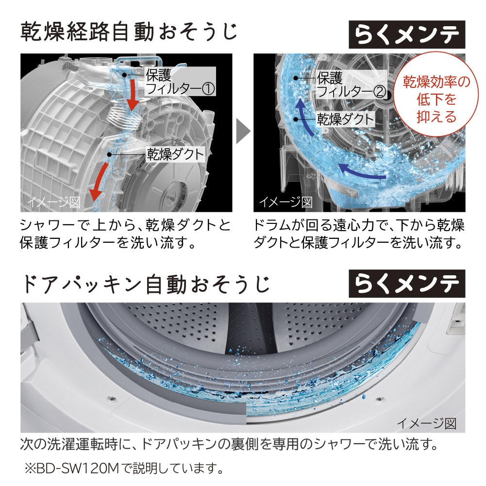 面倒だった乾燥フィルターのお手入れは不要になりました。乾燥時のホコリや糸くずは、次の洗濯運転時に、3つの自動おそうじ機能で洗い流して、[大容量糸くずフィルター]で捕集します。お手入れがしやすいラウンド形状で、お手入れの頻度は約2週間に1回でOK(※1)。また、洗濯槽・乾燥経路・ドアパッキンの3つを強力洗浄する「らくメンテ洗浄」コース(槽洗浄4時間)も搭載しています(※2)。