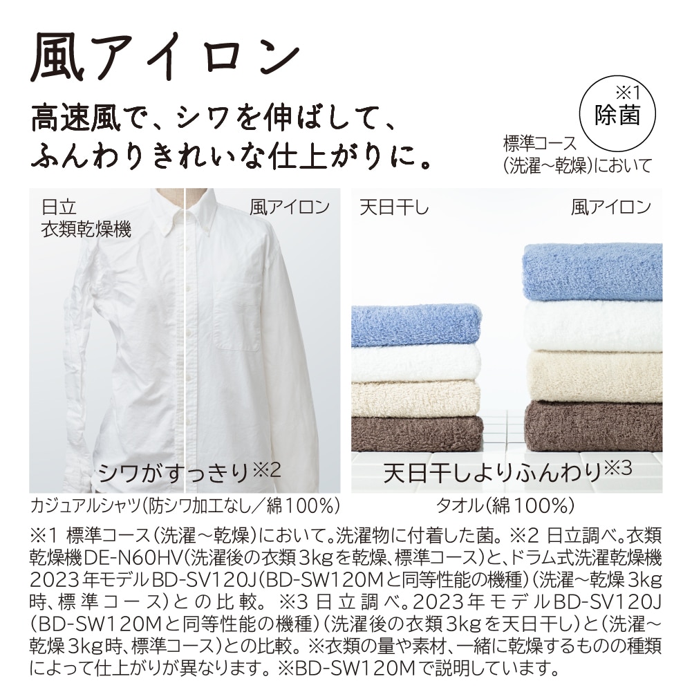 高速風の力で、シワを伸ばしてしっかり乾燥。また、手前から衣類に直接風を当てる日立の特許技術により、風が遮られず、袖まできれいに仕上げます。さらに、衣類温度約65℃(※)の低温乾燥で、ふんわりやさしく仕上げます。