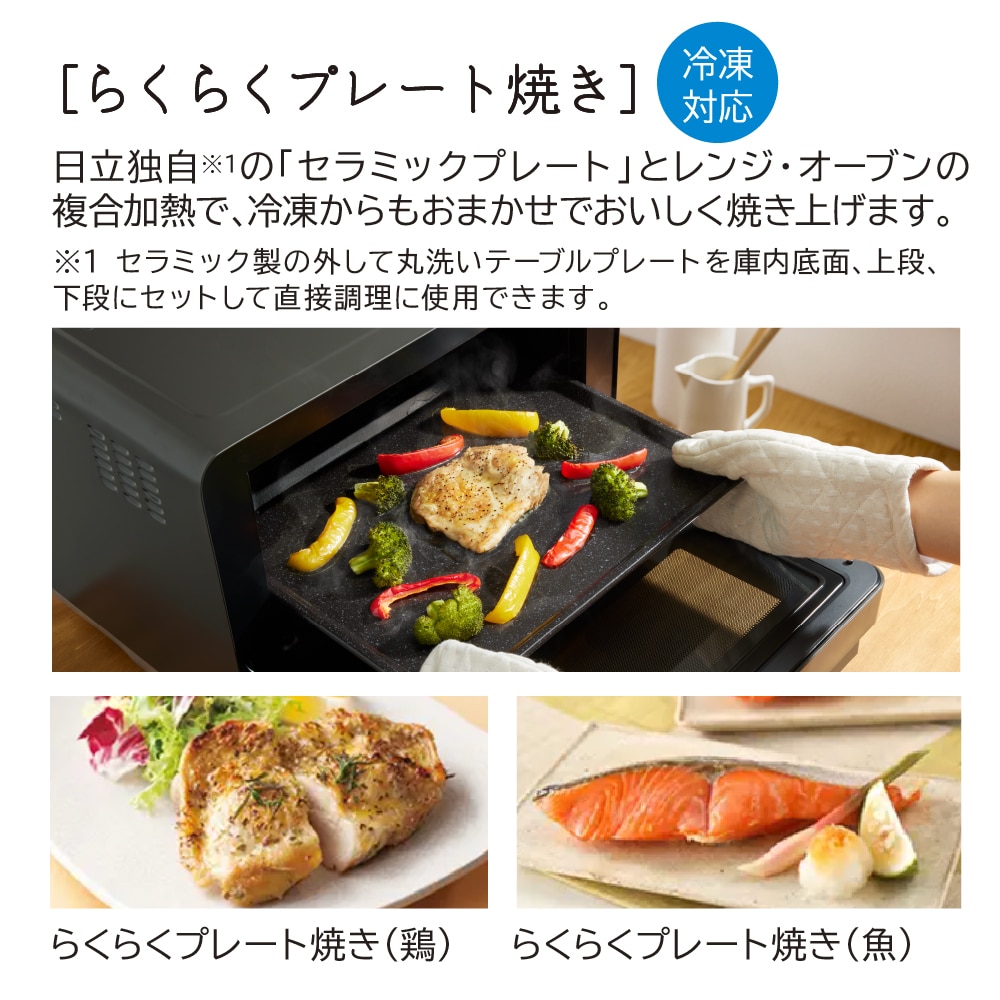 日立独自(※)の「セラミックプレート」とレンジ・オーブンの複合加熱で、冷凍からもおまかせでおいしく焼き上げる「らくらくプレート焼き」