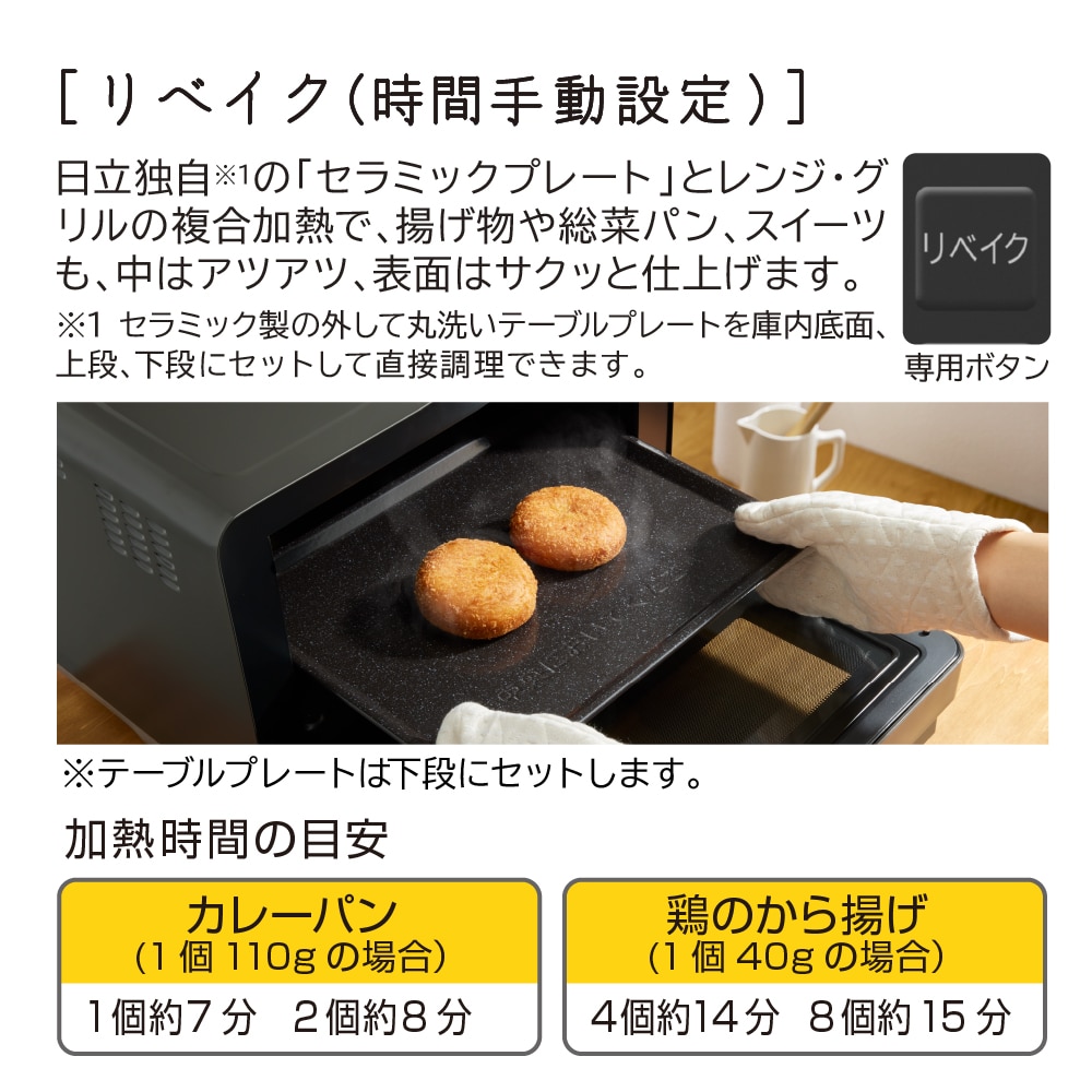 日立独自(※)の「セラミックプレート」とレンジ・グリルの複合加熱で、揚げ物や総菜パン、スイーツも、中はアツアツ、表面はサクッと仕上げます。