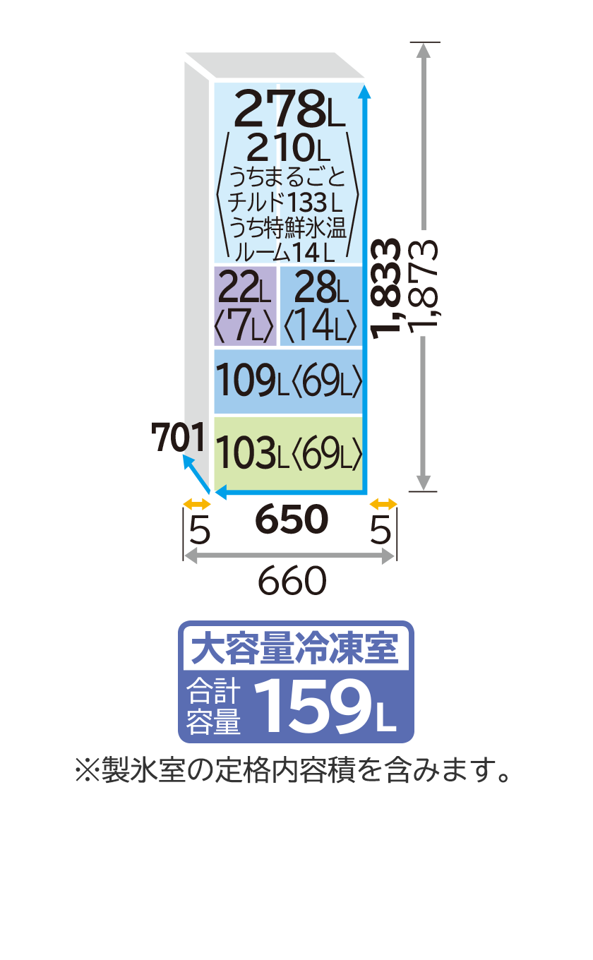 ※1 冷凍室上下段、製氷室の定格内容積の合計。食品収納スペースの目安は90L。