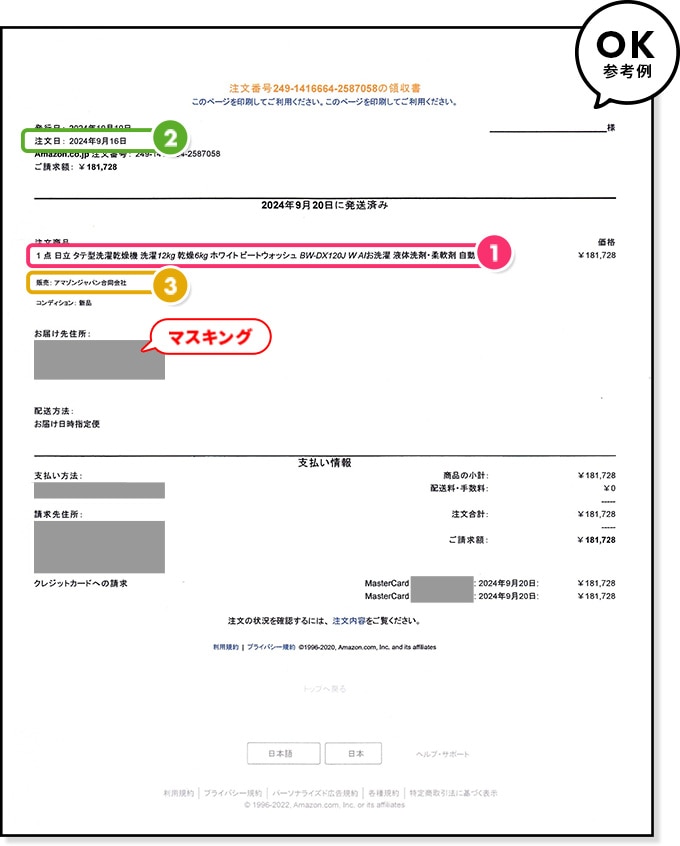 ※お客さまの氏名、住所、電話番号、販売店の会員番号が入っている場合はマスキングしてください。