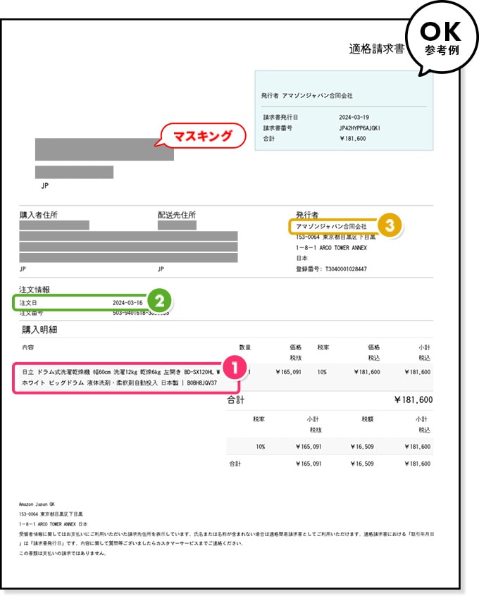 • 2領収書、適格請求書記載の購入日